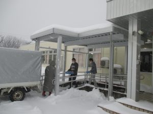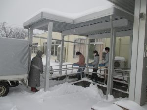 大きな屋根のおかげで、雪の中でも搬入作業がスムーズに行え、車椅子の方も濡れずに施設に入ることができるようになりました。